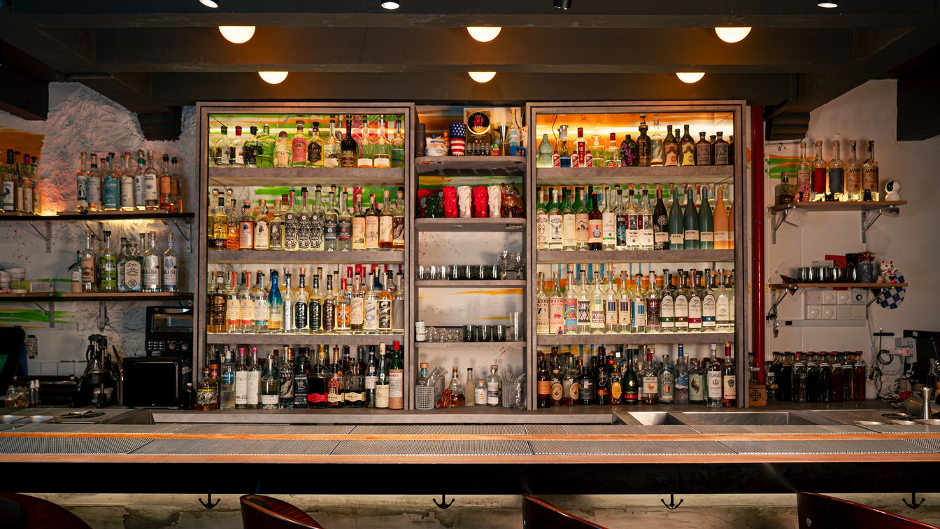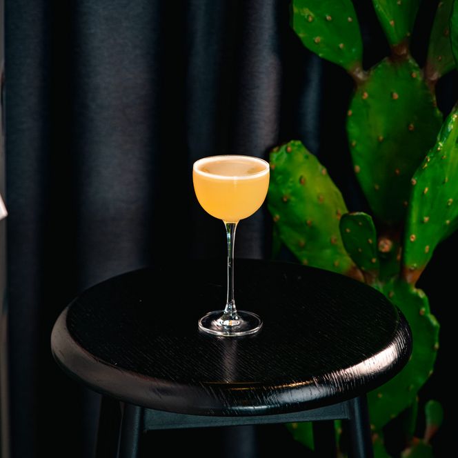 Von einem Café durch einige schwere graue Vorhänge getrennt, verbirgt sich im hinteren Bereich ein minimalistischer Raum, bewusst schlicht gestaltet, um zum Entspannen einzuladen. Die Getränkekarte verbindet Mexiko und Asien – mit Agave und Reis als Hauptzutaten in den kreativen Cocktails.
