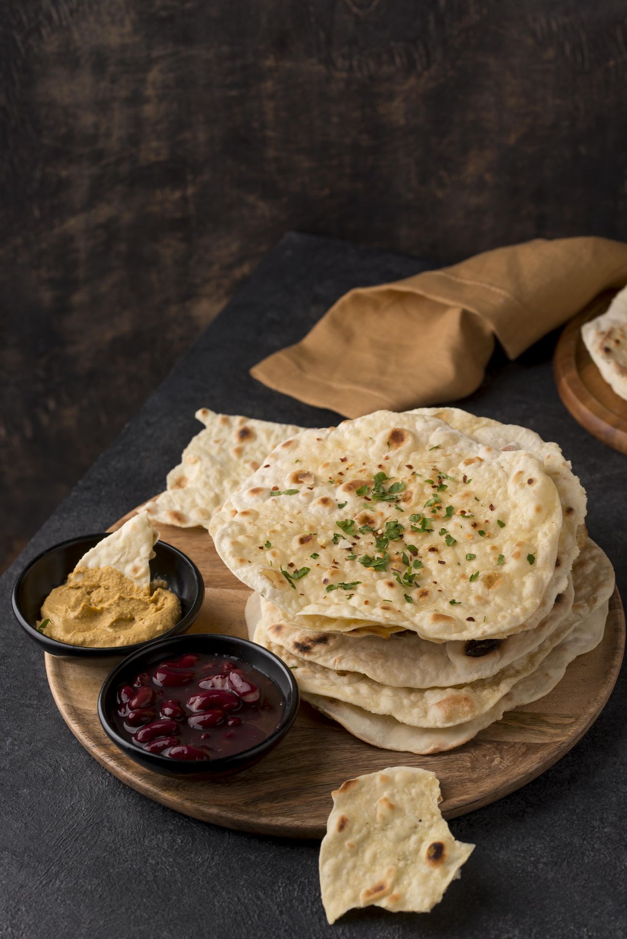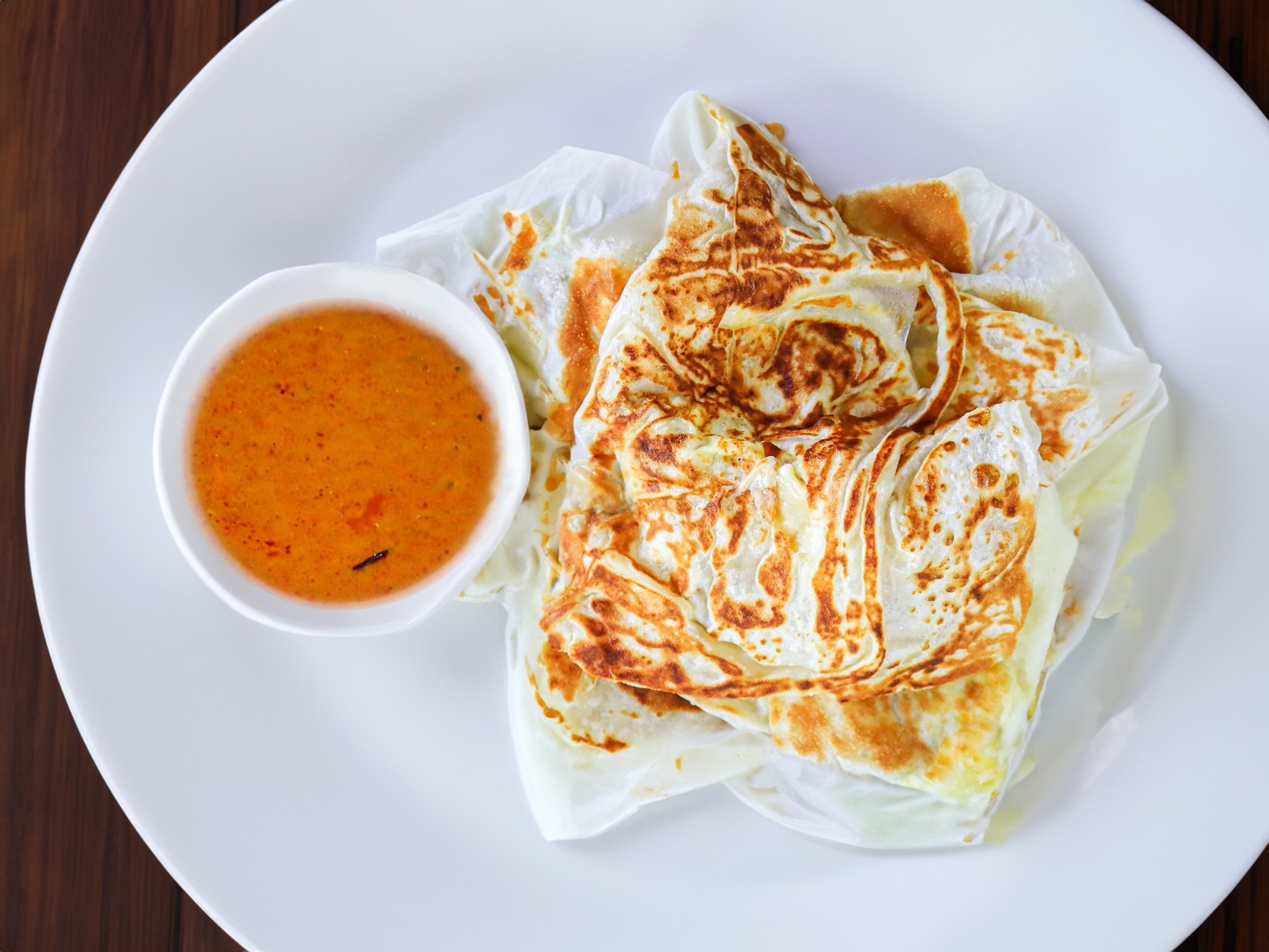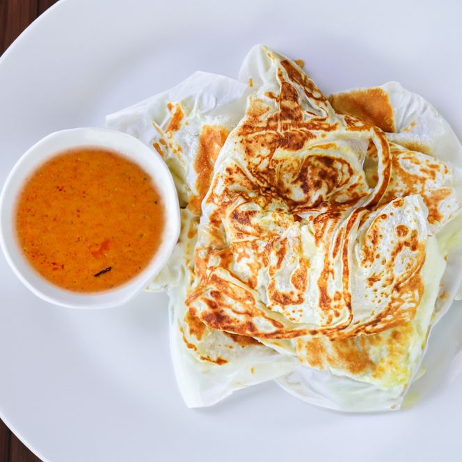 Anschließend wird der Teigball erneut geglättet, geölt und so lange gebacken, bis sich einige Stellen bräunlich verfärben. Üblicherweise mit Curry oder Dal serviert, ist Roti Prata ein beliebtes Frühstück oder eine Zwischenmahlzeit.