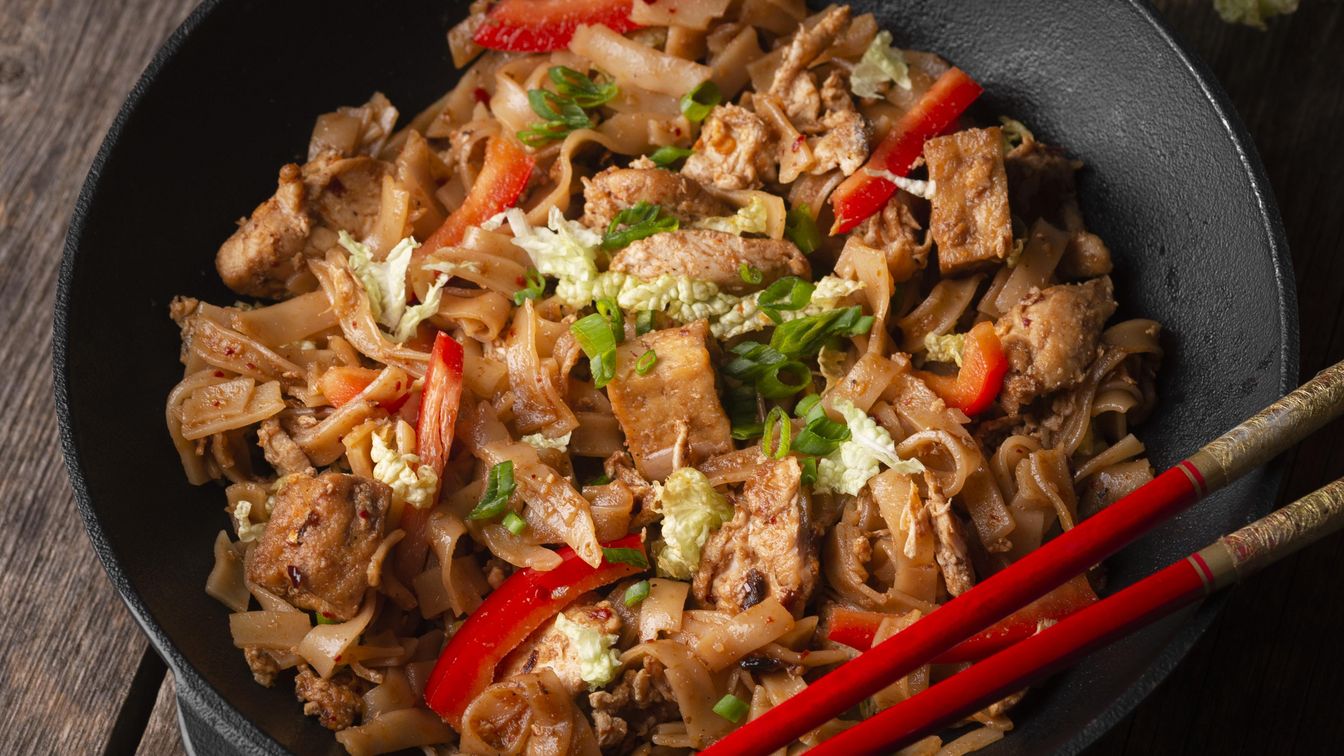 Im Wok werden flache Reisnudeln mit Garnelen, chinesischer Wurst, Eiern, Sojasprossen und Knoblauchschnittlauch kurz angebraten und anschließend mit Sojasauce und Chilipaste übergossen. Zu den weiteren Zutaten zählen Fischfrikadellen und Belachan (fermentierte Garnelenpaste).