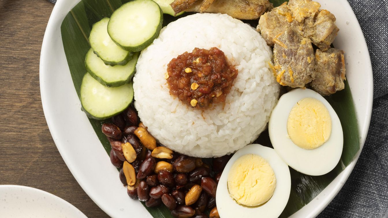 Hinzu kommen gebratene Sardellen oder gebratenes Huhn, die mit dem Reis auf einem Bananenblatt serviert werden. Als Beilagen gibt es geröstete Erdnüsse, frisch geschnittene Gurkenscheiben sowie ein hartgekochtes Ei oder ein Spiegelei. Natürlich darf Sambal – eine feurige, aber aromatische Chilipaste – nicht fehlen.